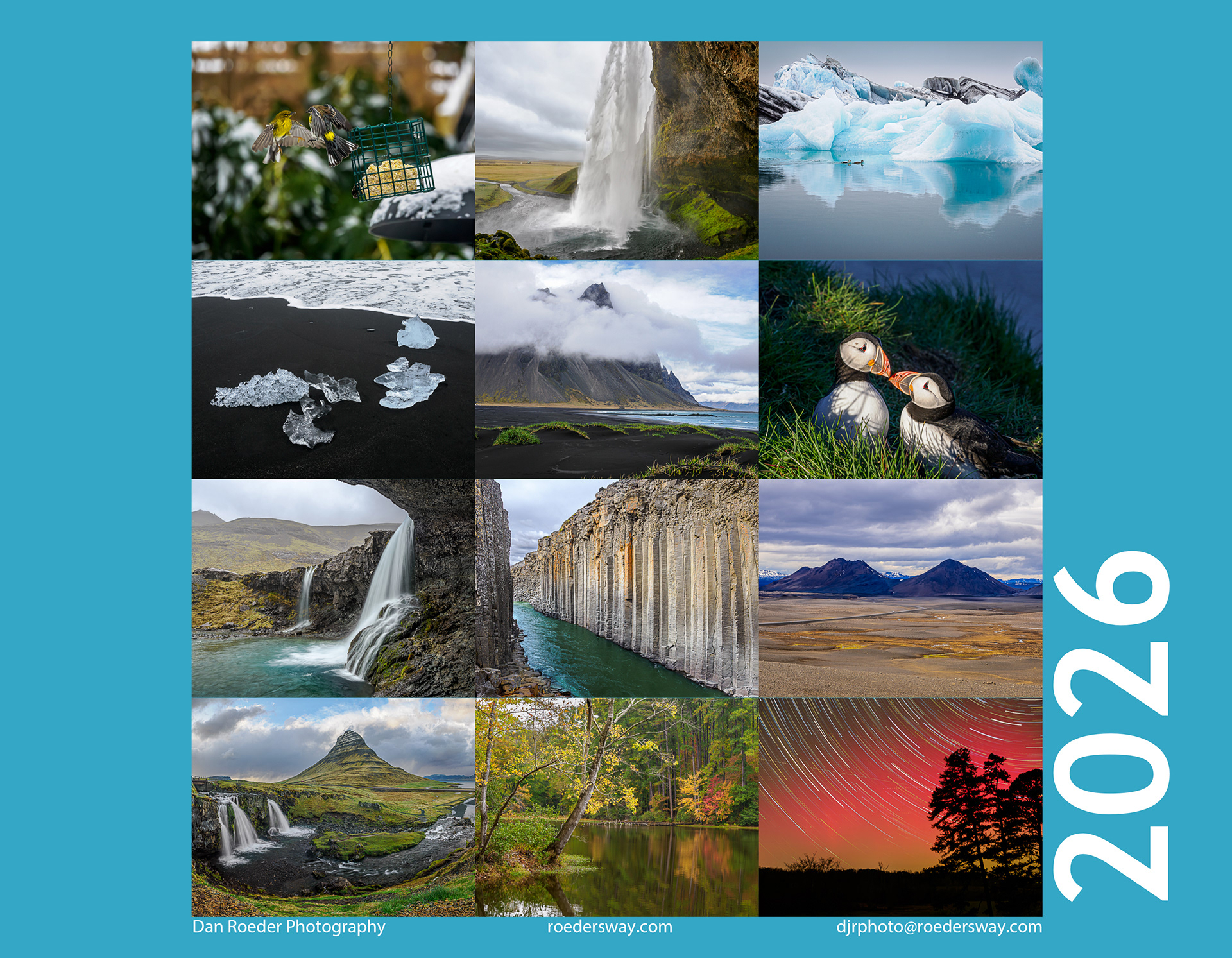 We didn’t get away much this year, but we did have an 8-day getaway to Iceland. It was quite a trip. We drove around the Ring Road and saw many breathtaking sights. The most lasting impression we had coming away from our visit to the “Land of Fire and Ice” was the variety of the landscape and how the scenery changed at almost every turn. I could have made this year’s calendar another single-place appointment-keeper like last year’s, but I thought I’d throw a few photos from close by in the mix. I will provide other photos from Iceland in the monthly location descriptions that can be accessed via the QR code for each month.