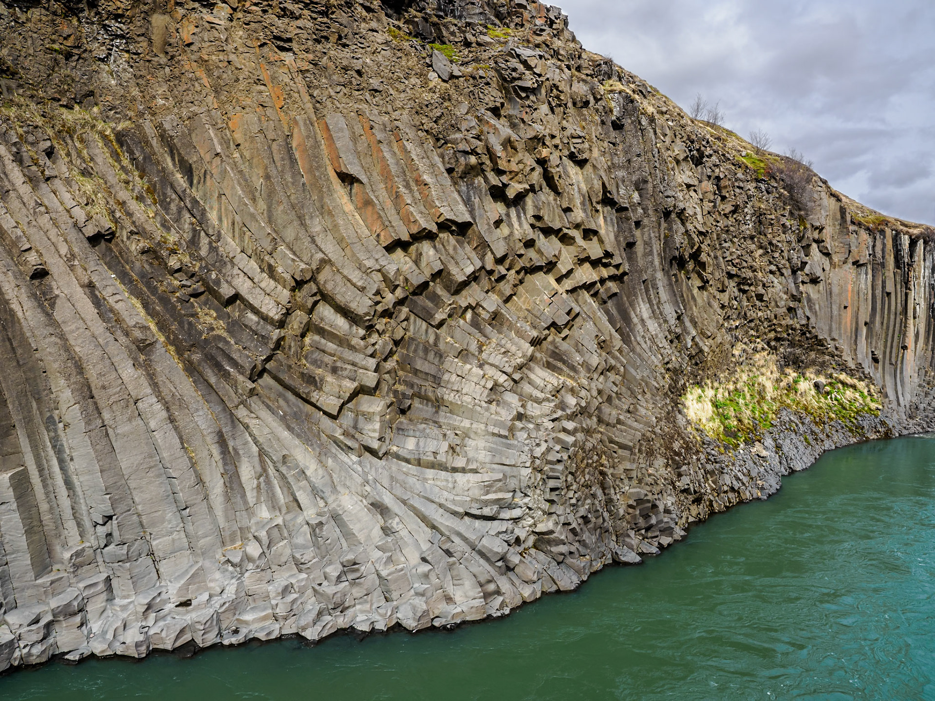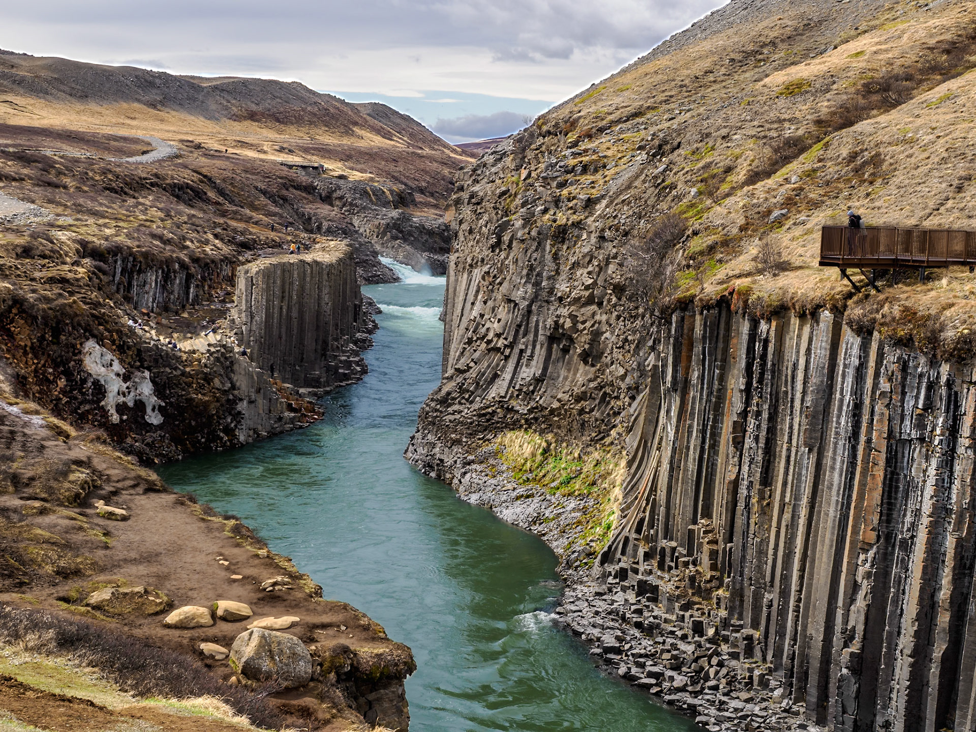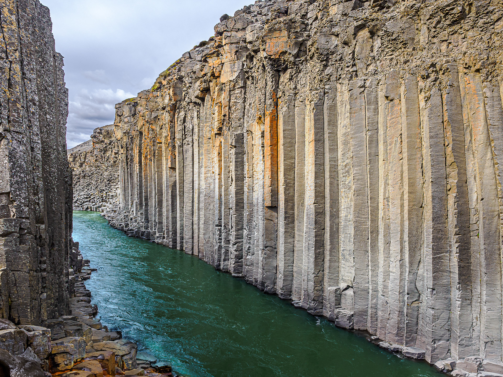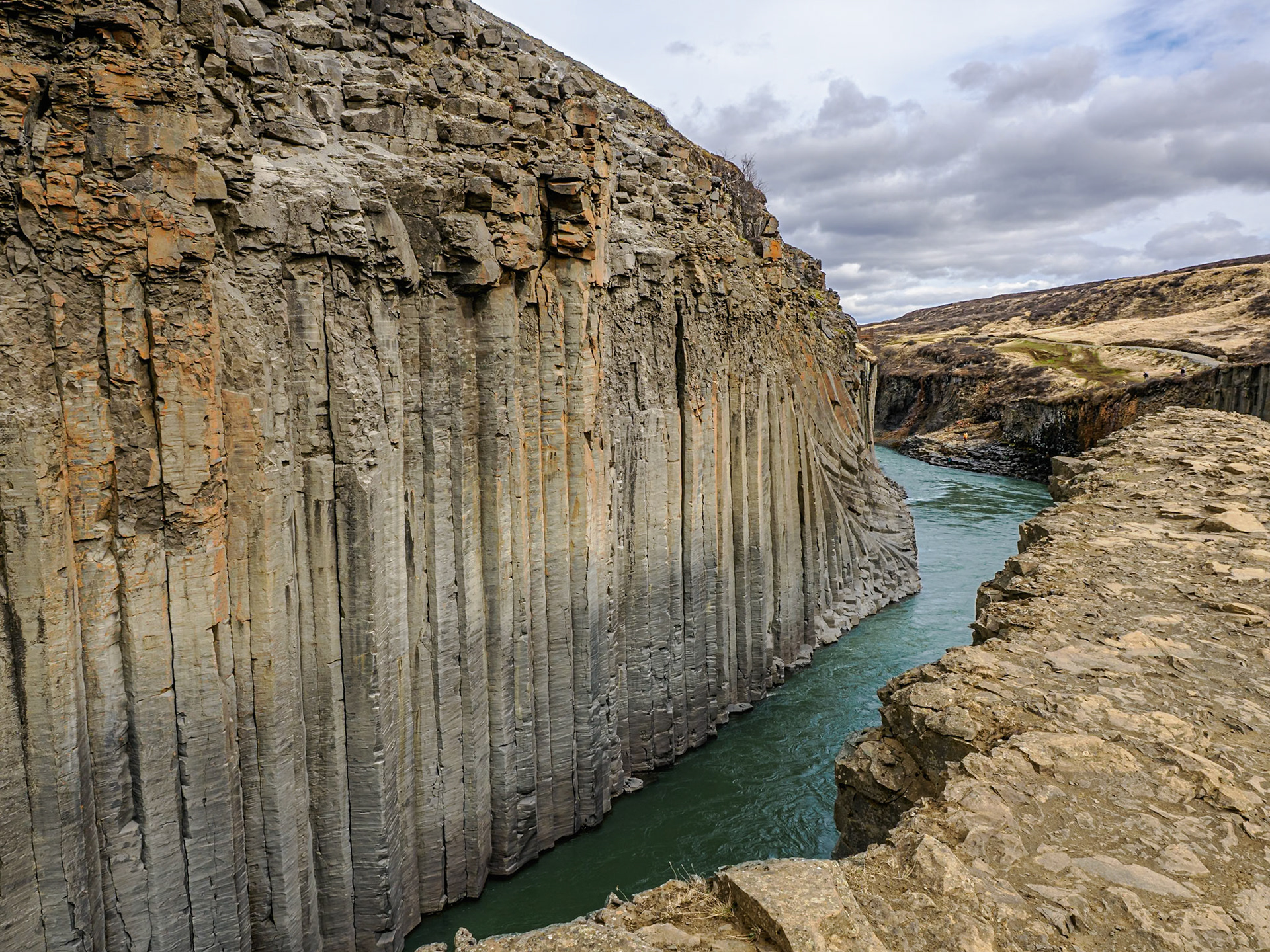 Stuðlagil Canyon - is located in Jokuldalur Valley in East Iceland. For generations, the area was considered too rugged for settlement, with only wandering sheep navigating its terrain. The canyon is composed of hexagonal basalt columns formed by the slow cooling and contraction of thick lava flows during volcanic activity. This type of geological structure is found in several places in Iceland, but Stuðlagil is notable for the height, number, and alignment of its columns. The canyon’s formations rise vertically from the riverbed, with some reaching 10-15 feet in height.