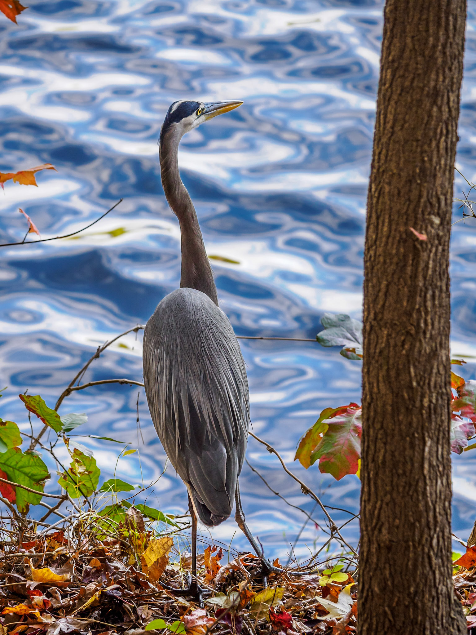 I was walking on the final section of the southern path and making a lot of noise trouncing on the fallen leaves when I heard a “kerplop” of something entering the water. I figured it was a turtle that heard me coming on retreated into the cover of the lake. To my surprise, it was the heron from the foggy day! He was fishing on this side of the lake. I slowed down and kept my distance so not to make him fly away. He steadily walked along the shore looking for an appetizer. He allowed me to walk parallel and above him on the trail. He may not have seen me because of the trees between us and as he stopped to check for fish, I would search for a mostly unobstructed view of him to take a photo. The combination of the choppy water and blue sky made for an interesting background in a couple of the photos I managed to capture. The heron eventually turned around and I carried on to the north side of the lake.