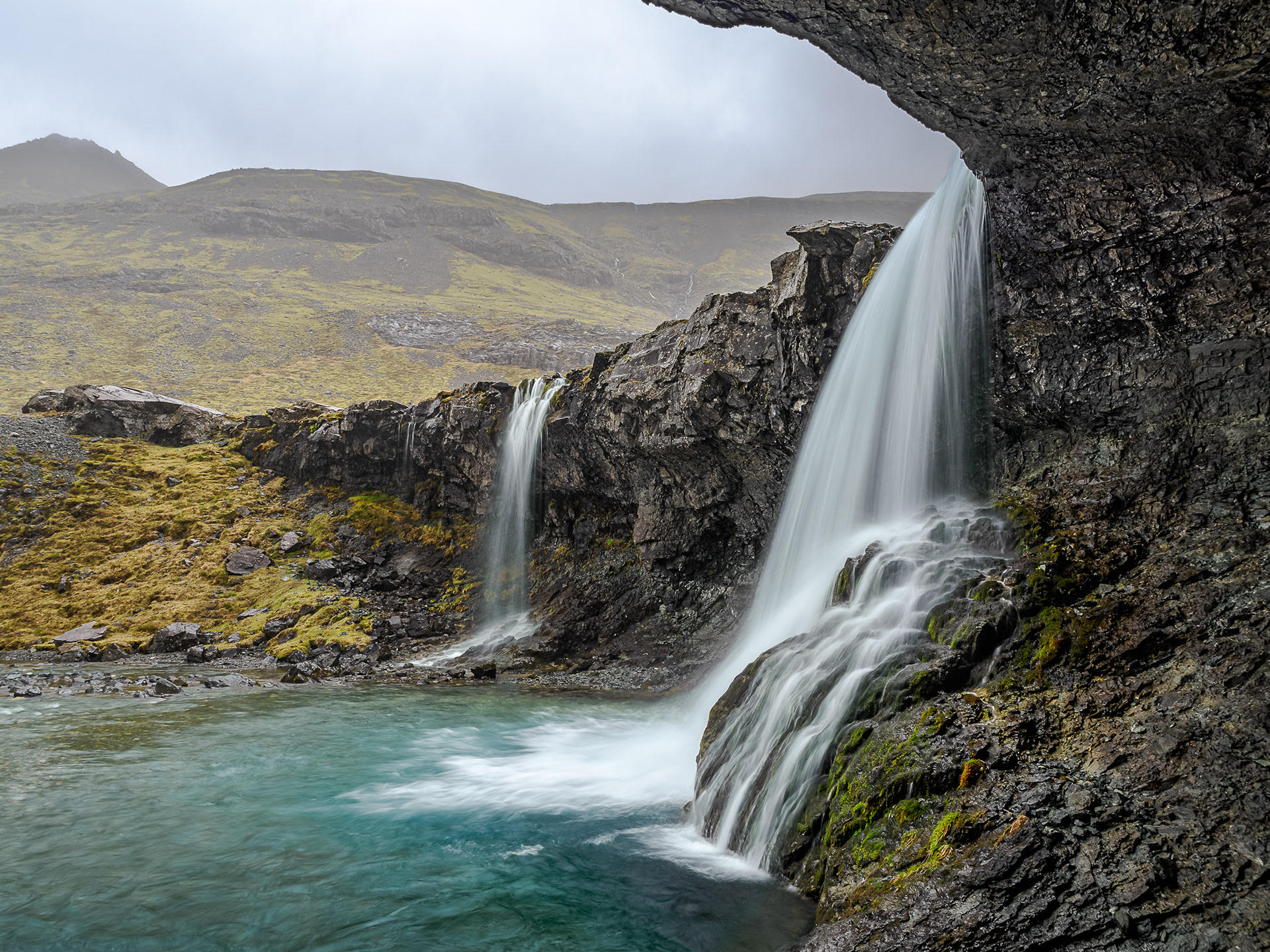 I had heard about and seen photos of a small waterfall in the Eastern Region of Iceland, and I had scouted it out on Google Maps, so I knew right where to turn off the Ring Road. The waterfall, named Skútafoss, is a waterfall not too many people visit, and it’s not on any tour bus route. There were four other people at this location when we arrived, and we crossed paths with them as we were walking to the waterfall. Skúti means a small cave in Icelandic. We were standing in the small cave when I made this photograph. This was one of our favorite waterfalls in Iceland because of its uniqueness.