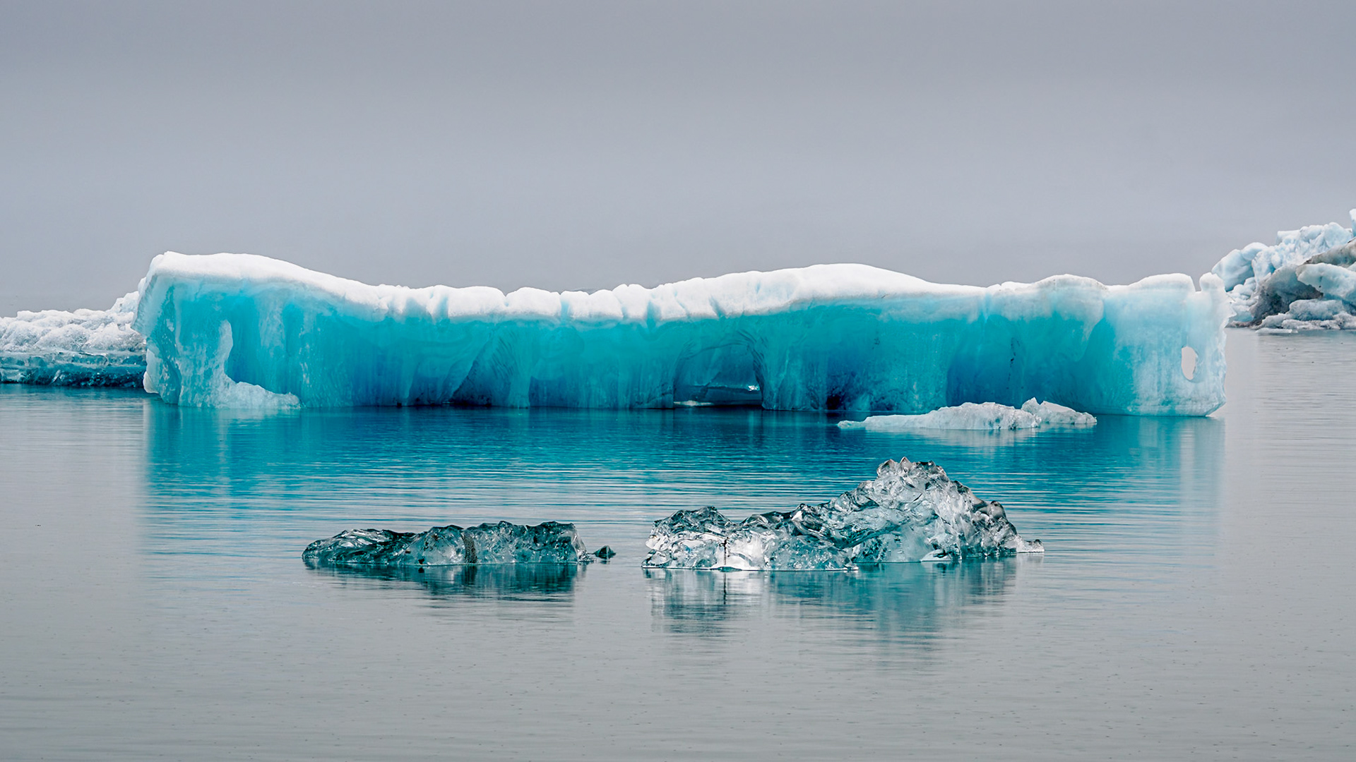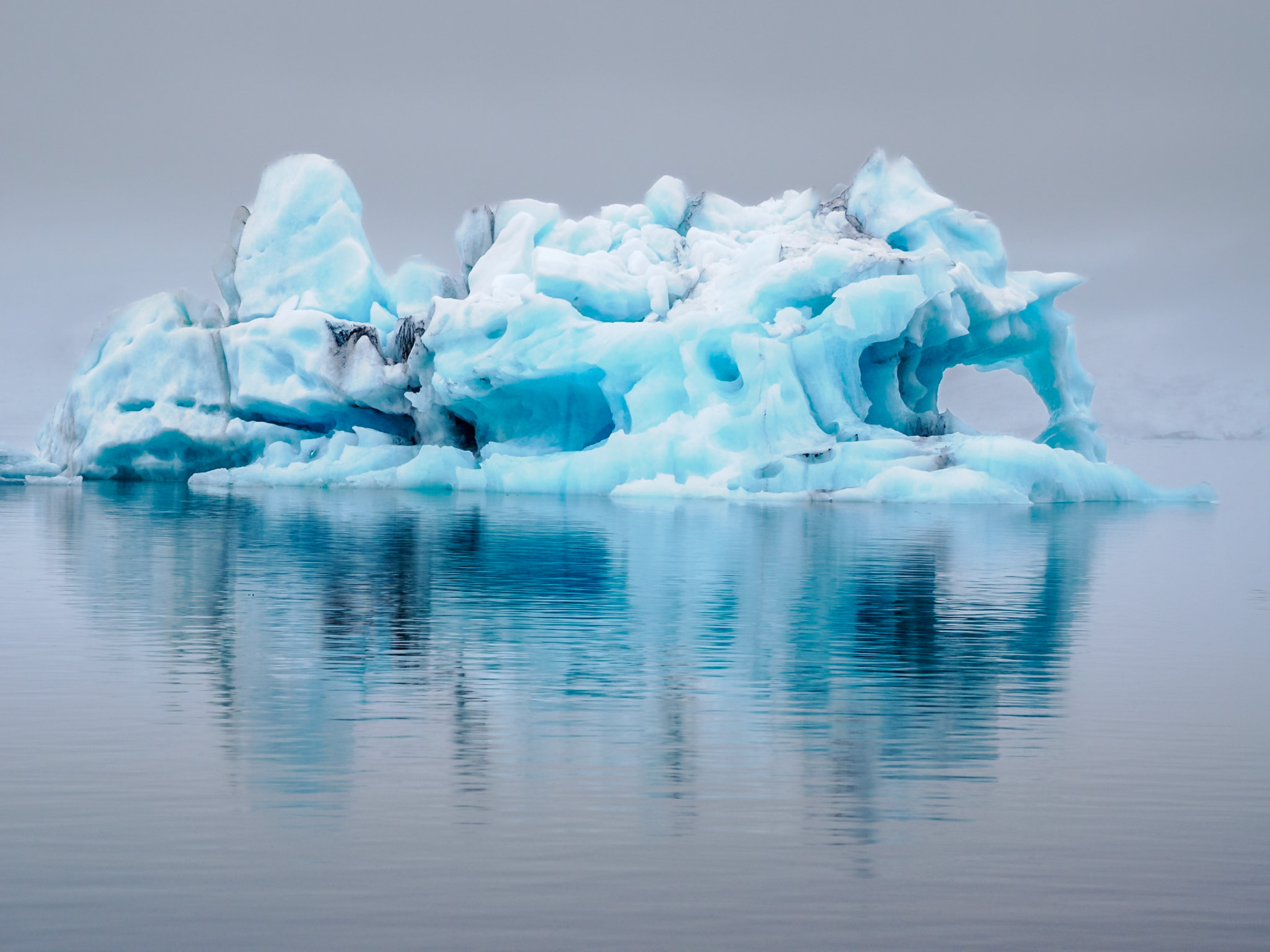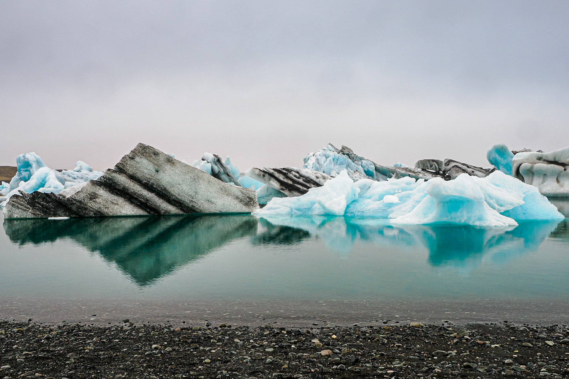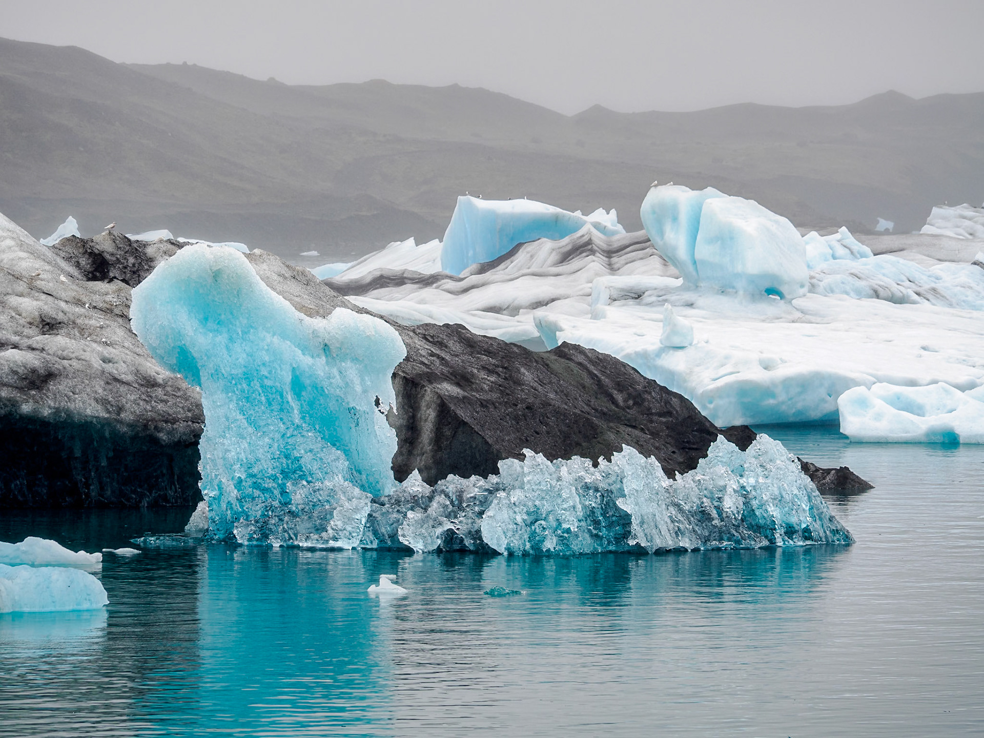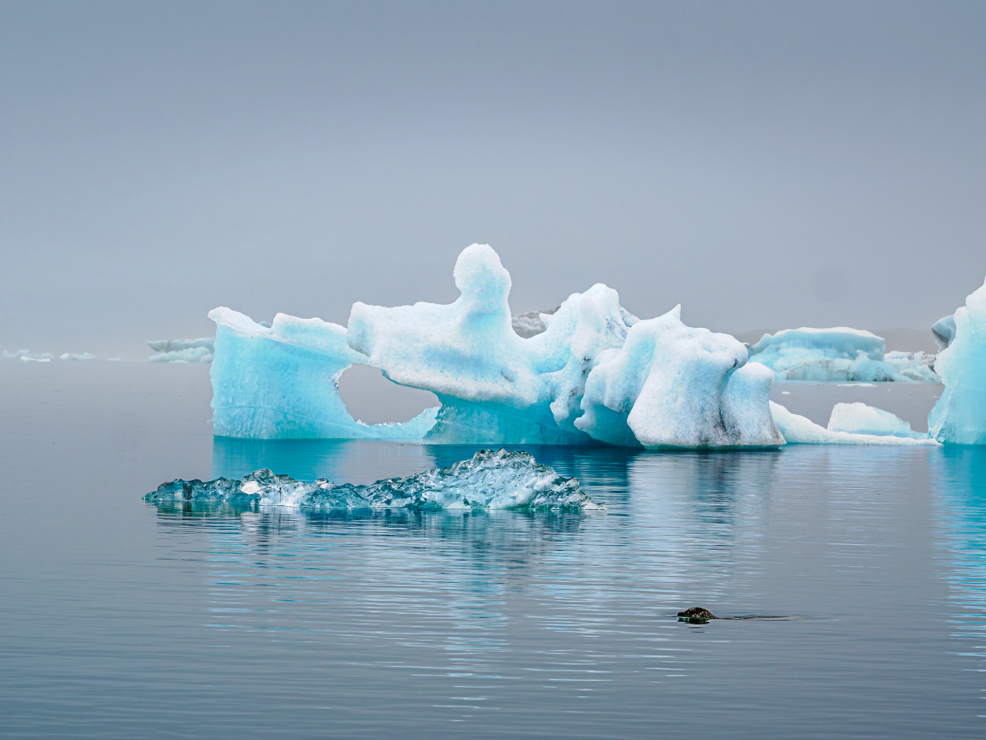 Jökulsárlón Glacier Lagoon, which is known for icebergs floating in the Jökulsárlón lagoon. The icebergs are from the Breiðamerkurjökull Glacier (about five miles away), which is part of Vatnajökull, a vast dome of ice that rises to a height of 3,000 feet. Unfortunately, on the day we visited the lagoon, the fog made it impossible to see the glacier from where we were. Jökulsárlón developed into a lake after the glacier started receding in the late 19th century. The lake has grown since then at varying rates because of the melting of the glacier. The lake covers an area of about 9.7 square miles. In 2009, it was reported to be the deepest lake in Iceland, at over 930 ft, as glacial retreat extended its boundaries.