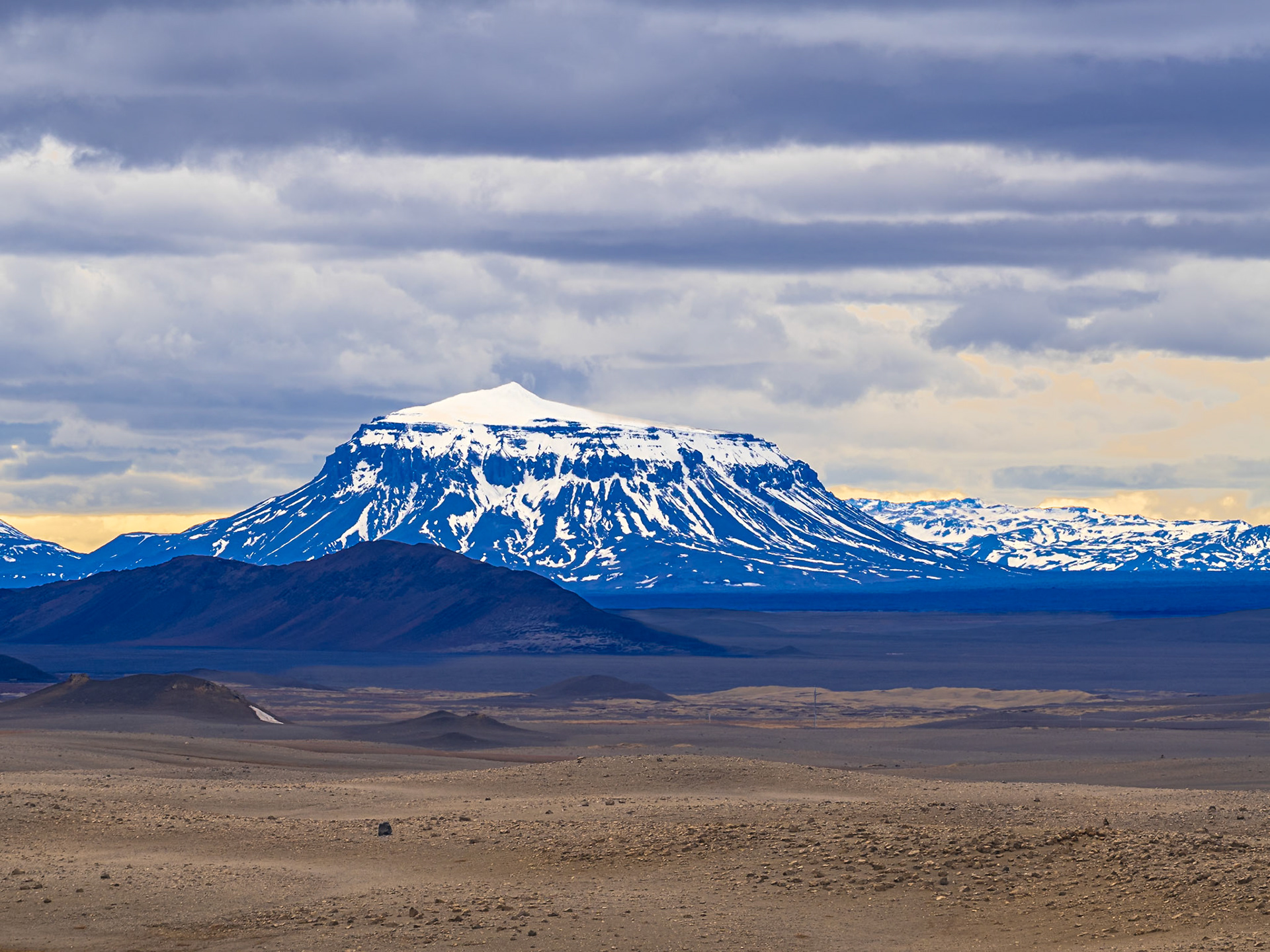 After leaving Stuðlagil Canyon, we drove back to the Ring Road and headed west to our next location. Before we knew it, we had been transported to what looked like another planet. Fortunately, there was a large parking lot off the side of the road that allowed visitors to get out of their cars, drop their jaws, and gaze at the strange scenery in another stunning Iceland location. Welcome to the Odadahraun Desert, Iceland’s most extensive lava field and most desolate destination. The windswept brownish-orange field lay before us with the Route 1 curving back around from the left as it headed to a black mountain range with snow-covered peaks behind them. The photo here captures only part of what could be seen from the parking lot (pinned in Google Maps with the name of “White Chair Parking Lot” after a rough, wooden, white chair that used to grace the car park). Further to the left of this view was Herdubreid, a table mountain situated north of Vatnajökull (see below).